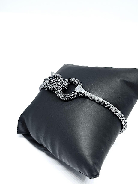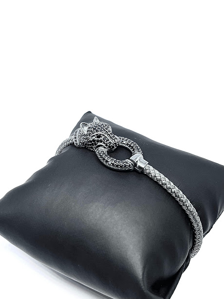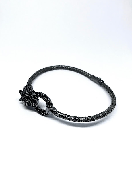 Description: Black Zircon encrusted Jaguar head Bracelet with a weave braided strap